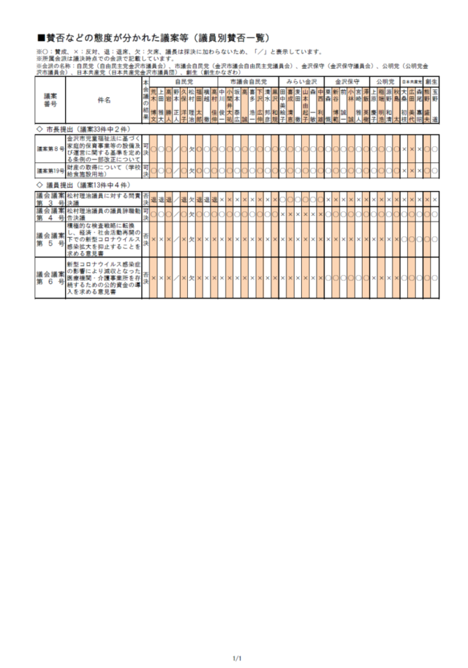 6月議会の議案の中で態度が別れたものと、意見書などの議員別賛否一覧です。
