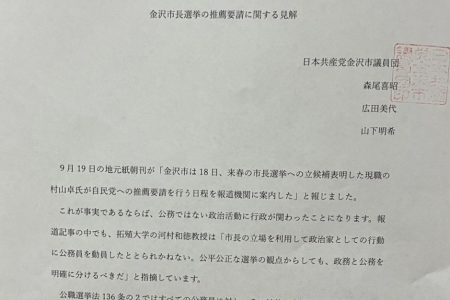 9月19日の地元紙朝刊が「金沢市は18日、来春の市長選挙への立候補表明した現職の村山卓氏が自民党への推薦要請を行う日程を報道機関に案内した」と報じました。  これが事実であるならば、公務ではない政治活動に行政が関わったことになります。報道…