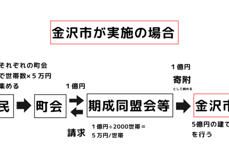 地元負担とは 金沢市は、金沢方式について次のように説明しています。 ※これはR6年度時点です。R7年度からは市負担が80/100、地元負担が20/100に変更されました。 というように、金沢市側が市負担と地元負担の割合を決めています。 しか…
