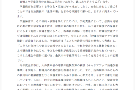 - 学童保育の拡充を!金沢市学童保育連絡協議会のみなさんが今年も金沢市に申し入れと意見交換を行いました。 学童保育は待機児童が出ている地域もありさらに整備が必要です。また、支援員の処遇が低く改善が求められます。お子さんが放課後を安全安心に過ごすために、学童保育拡…