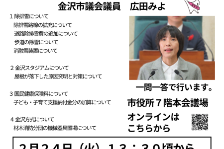 - 【第2回金沢市雪害対策本部会議の報告】みなさま、除雪おつかれさまですm--m 本日はいよいよ雪の捨て場がなくなり、排雪(トラックに積んで運ぶ)などの作業も各地で見られました。 各地域の状況やさまざまな事象をご連絡もいただきありがとうございます。今後に活かすよう求めていきます。 …