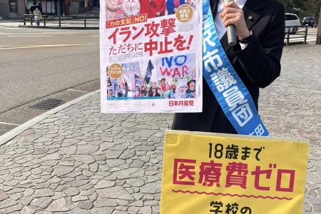 - 朝の出勤時宣伝を金沢市内で今朝は東山と元車で訴え 中内てるこさんも一緒に ほぼ全文です。↓ アメリカとイスラエルがイランへの攻撃を開始し1ヶ月が経とうとしています。子どもを含め犠牲者が日々増えています。みなさん、改めてこの先制攻撃はあきらかな国連憲章と国際法違反で…
