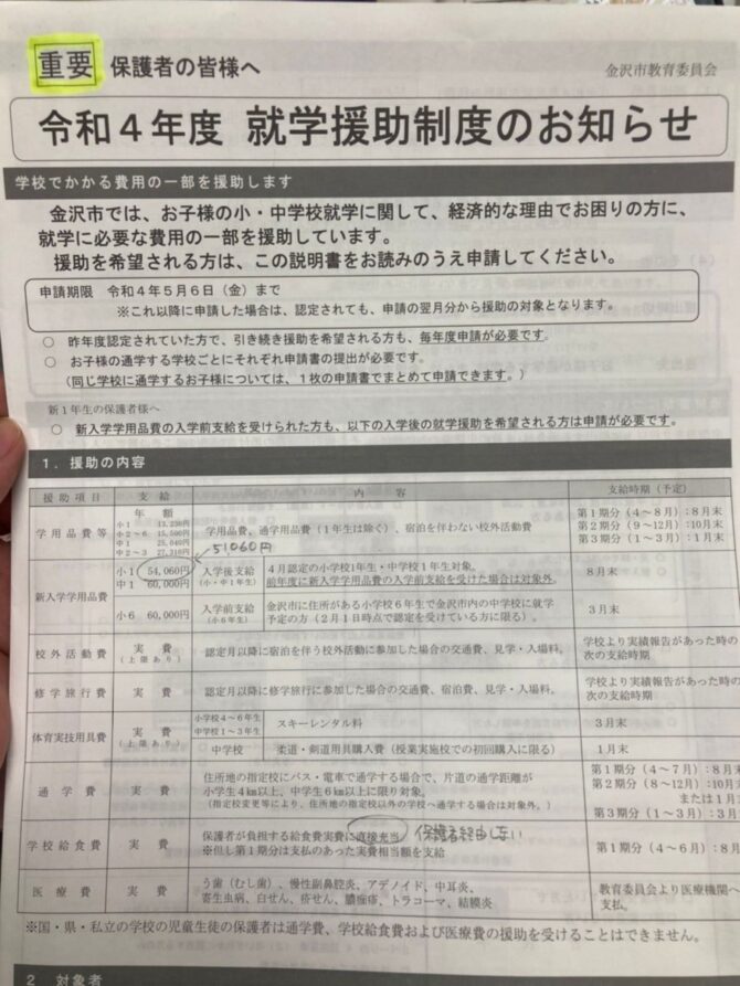 そこで、毎年ご案内しているのが、就学援助制度です。
