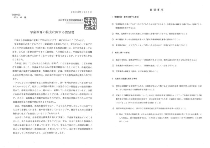 また、金沢市では学童保育に入りたくても入れない子どもも多く、整備計画が必要です。
