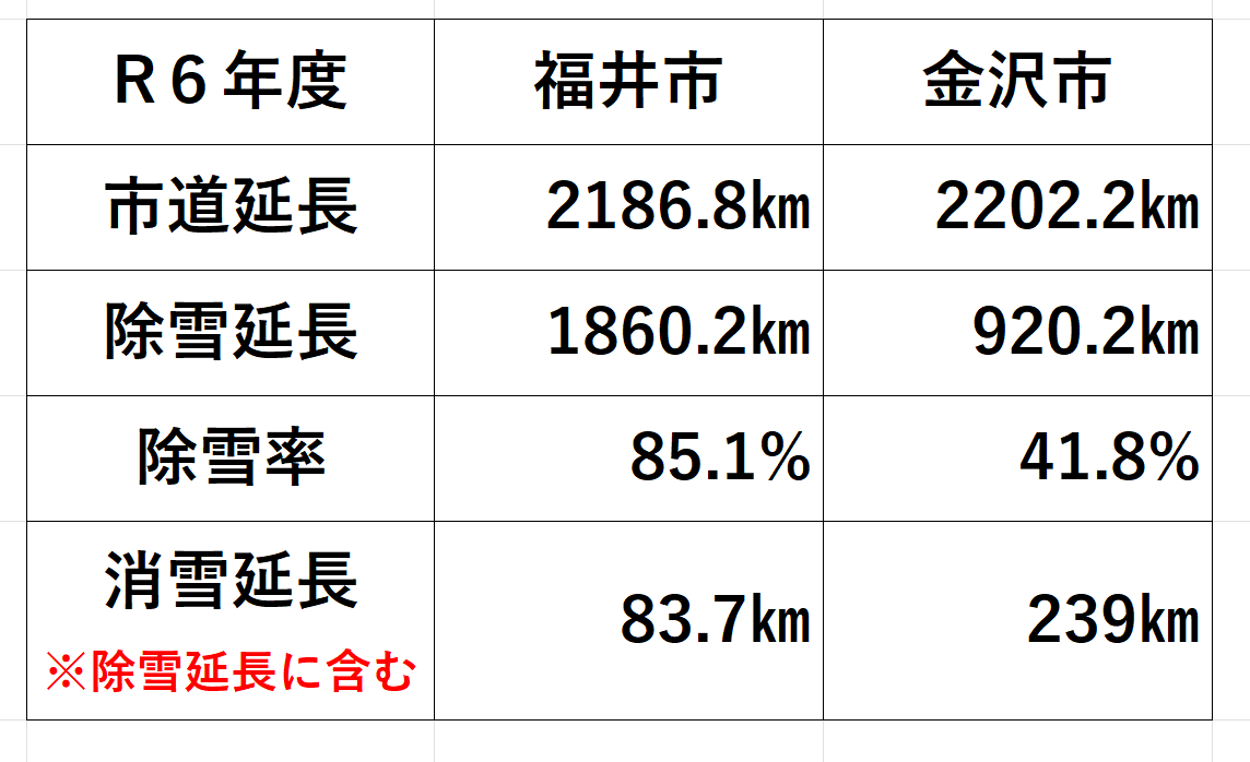 そこで、市道の長さが似ている福井市へ視察で伺い、行政の除排雪の取り組みの調査を行い、金沢市行政と比較してみた。
