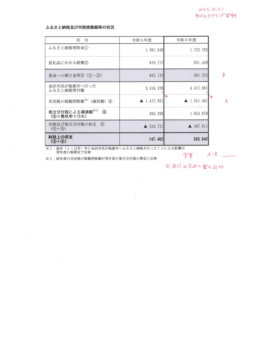 令和6年度によります寄附額でございますが、17億2270万円余となっています。これにかかる返礼品等の経費として8億3144万円余でございます。他方で、金沢市民が他都市へ行ったふるさと納税によります本市の個人市民税の税額控除額については15億5148万円余で、これに伴いまして地方交付税による補填があるわけなんですが、これが10億5387万円となりますことから、これらを総じた令和6年度の決算上の収支は、3億9364万円余のプラスとなっております。