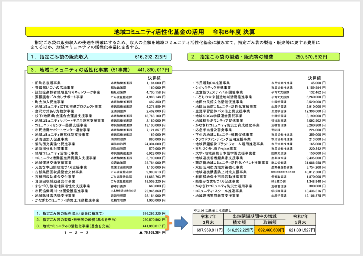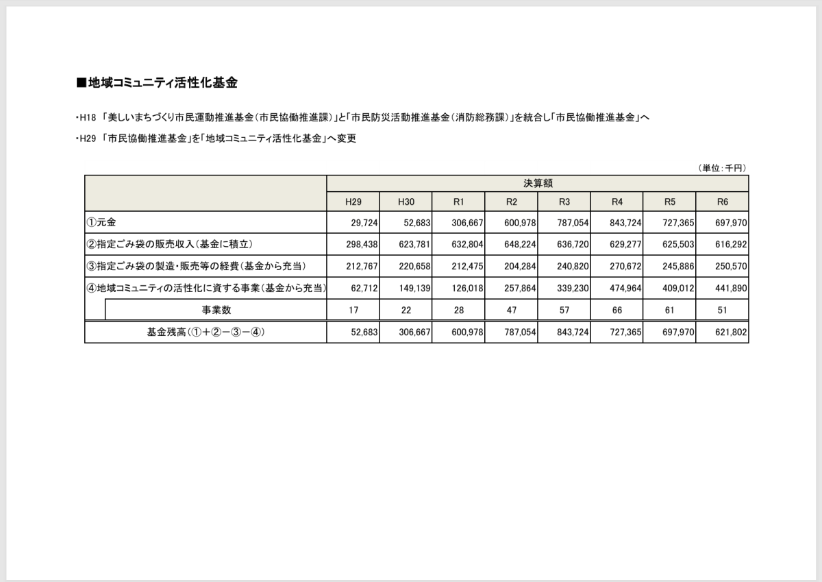 次に、コミュニティ活性化基金について伺います。資料をありがとうございます。2つの資料がありますけれども、2枚目の資料を見れば、元金、販売収入がどんどん減ってきているという中で、市民にとって必要な事業が行われていることについて質問をしたいと思います。