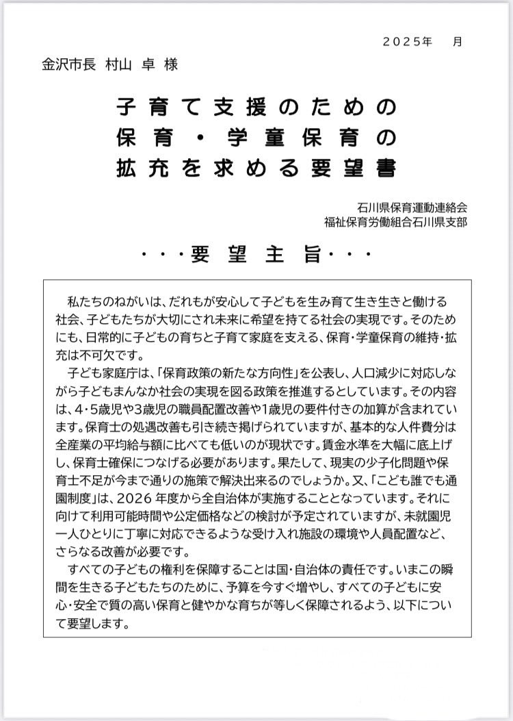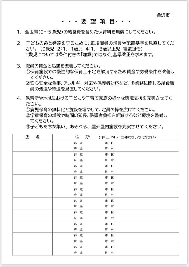 保育士の配置基準の改善はみなさまの取り組みもあり、国が戦後ぶりに動きました。金沢市はそれを上回る加算も行っています。しかし子どもの安全安心を考えればまだまだ。そして、さらなる処遇改善も必要です。