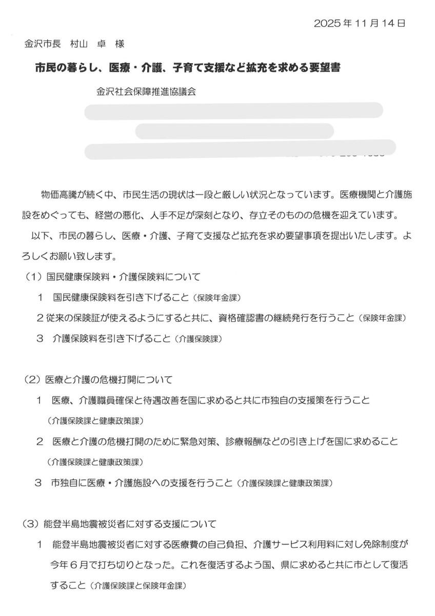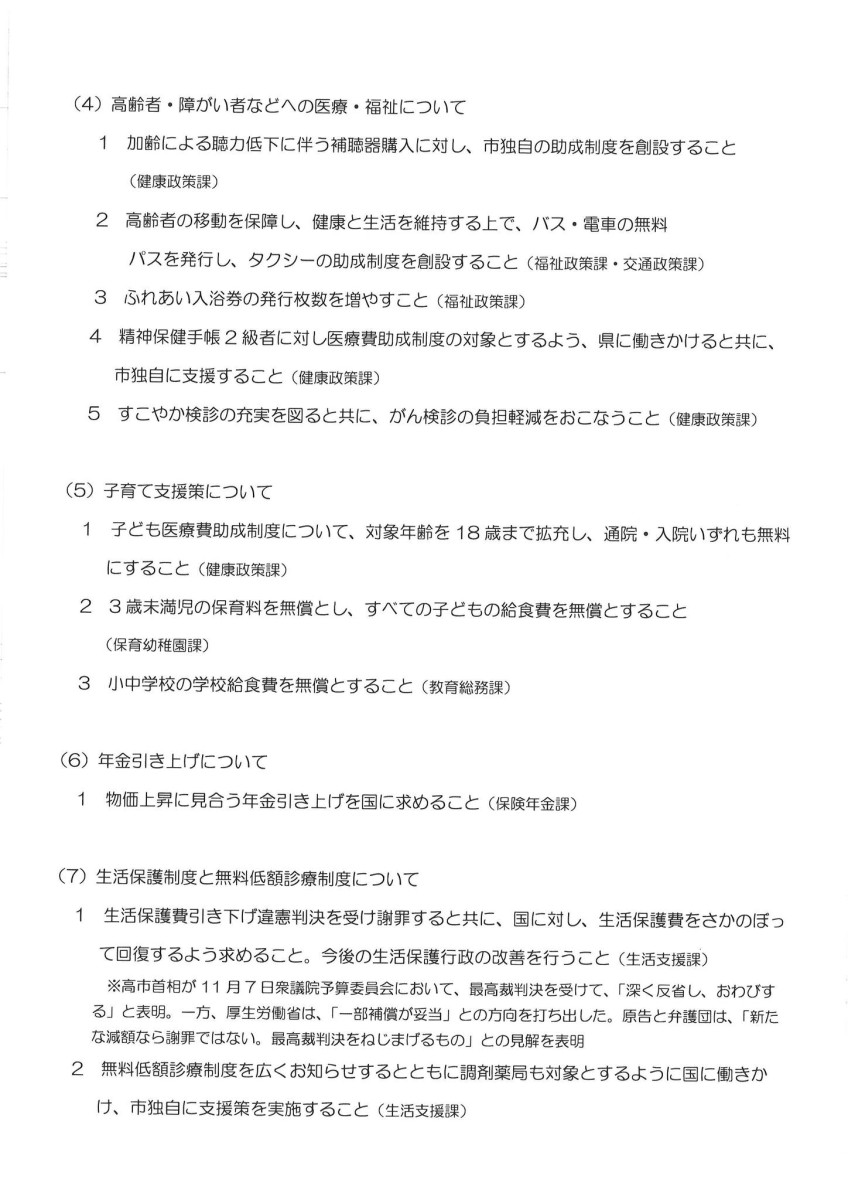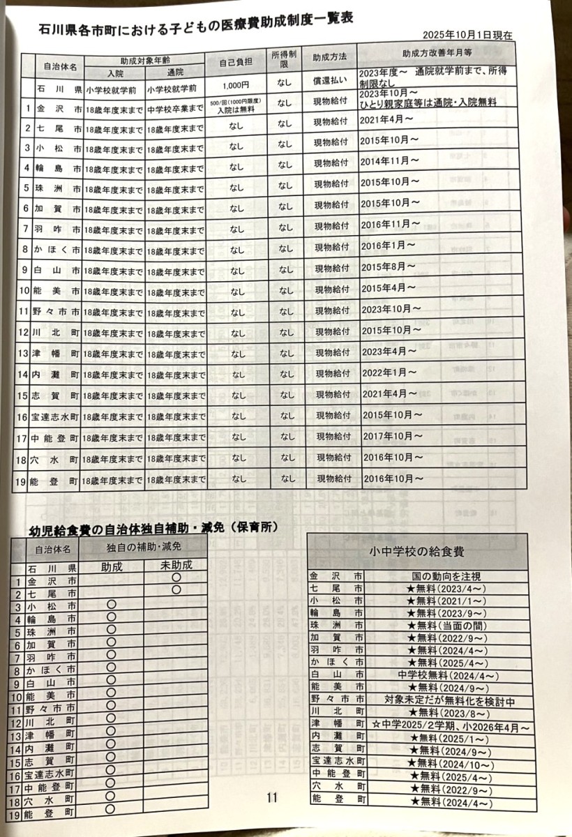 特に能登被災者の医療費や介護利用料免除の打ち切りには怒りのお声。子どもの医療費助成については県内で金沢市だけが通院について対象年齢が18歳まで達していない。保育の副食費についても金沢市と七尾市以外は独自の助成制度がある。小中学校の給食無償化についても金沢市と野々市市以外の市町はなんらかの無償化を行っており、野々市も検討段階に入っており残るは金沢市だけ。加齢性難聴の補聴器購入補助制度についても、1/4の自治体が創設しています。