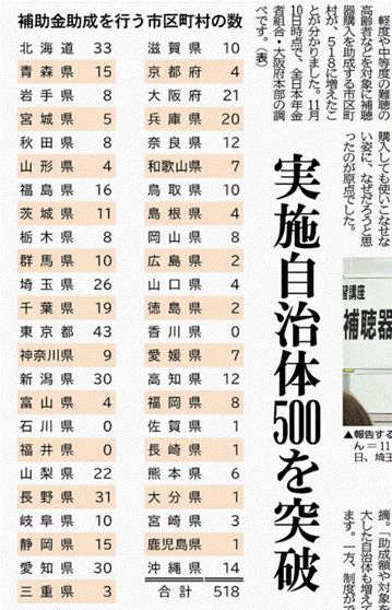 次は加齢性難聴に対する補聴器の購入助成についてです。高齢者の命と生活を守り、認知症予防としても効果のある補聴器の購入助成について、全国市町村で制度の創設が広がり、11月10日時点で518にのぼることがあきらかとなりました。47都道府県でみると石川県を含む3県の市町のみが行っていない状況です。国の交付金を活用をしている自治体もあります。以前紹介した山形市では「保険者機能強化推進支援金」を活用し、総合的な支援を行っています。さらに今年度からは、難聴高齢者の啓発や早期対応が『介護保険者努力支援交付金』の評価指標に入り、推進されています。市長、金沢市が県内で先陣を切って助成を行いませんか。これまで研究するとしていますが、どこまで研究が進んだのか伺うとともに、実現を求めますがいかがですか。