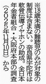 加齢性難聴者を対象とした補聴器購入補助制度について、中核市の状況を確認したところ、補助制度を持っているのは62市中28市と半数に満たない状況であり、また全国的な課題であることから、全国市長会から国に対して制度の創設を要望しておりますが、引き続き国や他都市の動向等を注視しながら検討していきたいと考えております。