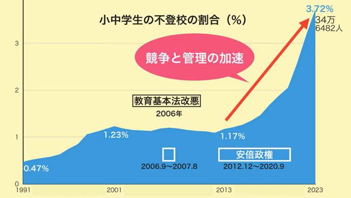 教育長。不登校対策を強調しながら、不登校を増やす教育政策を続けるのは道理がたちません。少人数で子どもが主体、学力テストもない、「競争と管理」を見直す政策転換をはかるべきですがいかがですか。
