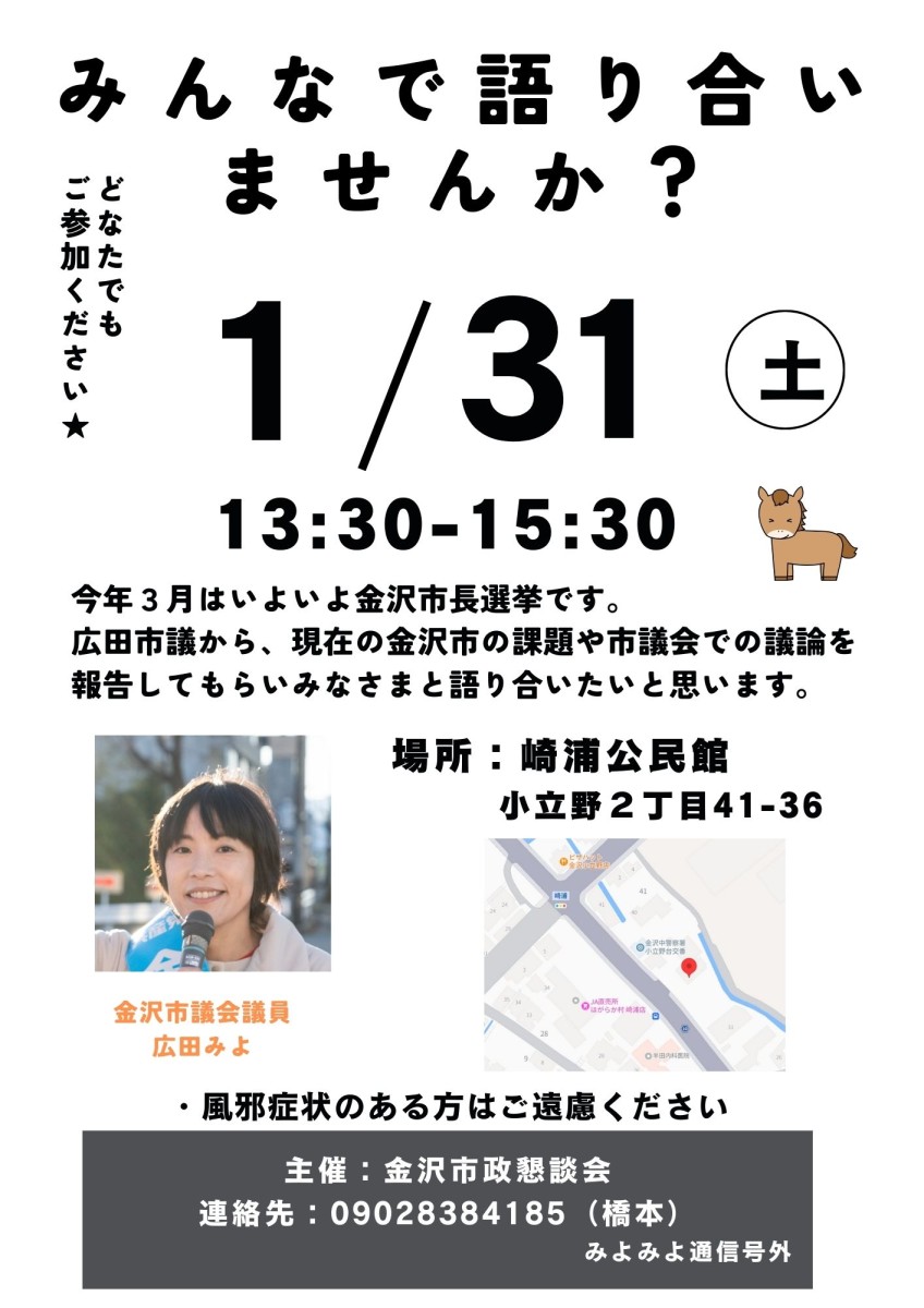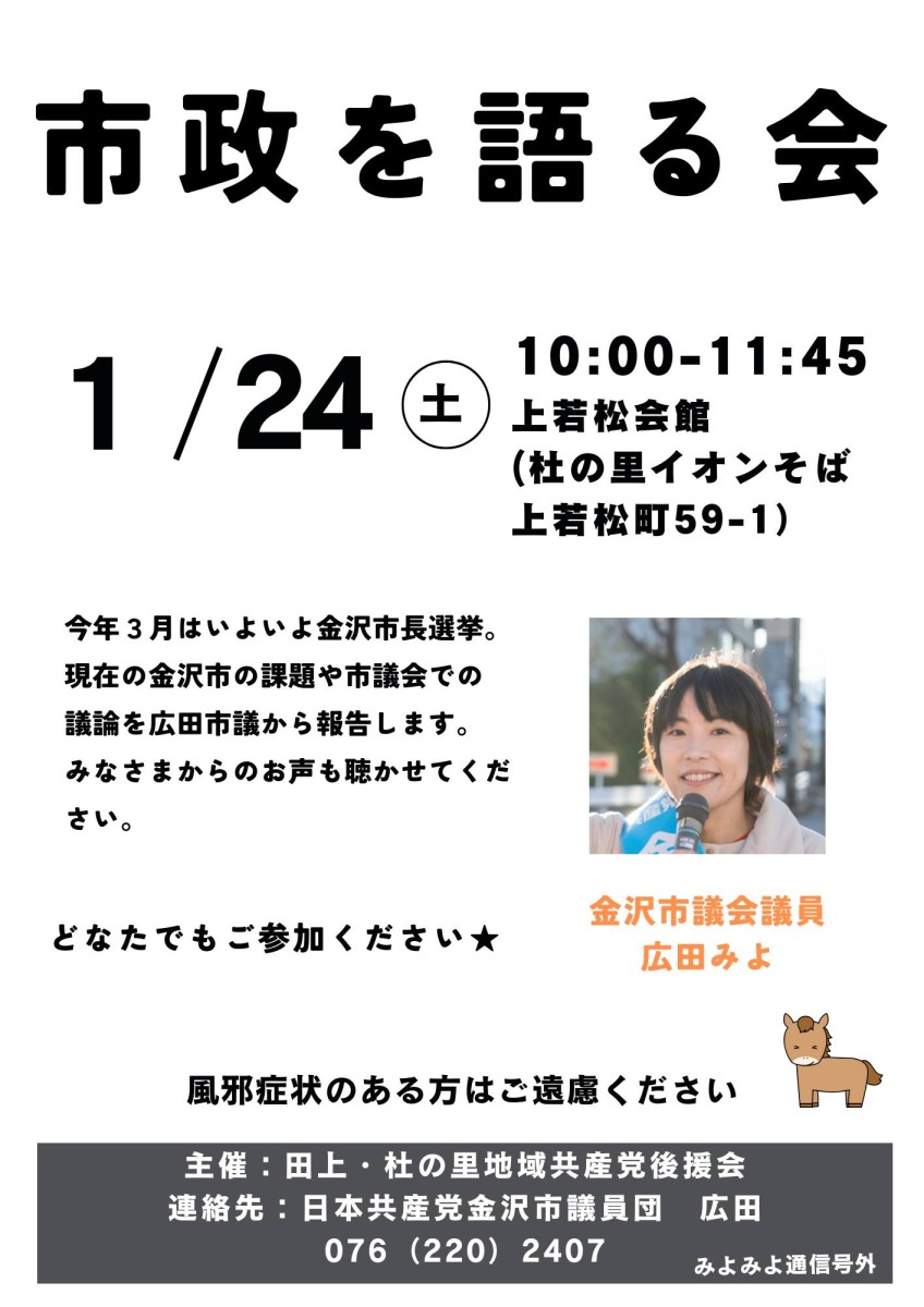 市政報告会のお知らせ 2026年1月21日 ブログみよみよ日記 お知らせ 今月の市政報告会のお知らせです。 どちらも駐車場は大丈夫です。 ぜひ、ご参加いただきご意見やご要望をお寄せいただければ幸いです。 1/24は中内てるこさんもかけつけます(^▽^)/ このページをシェア