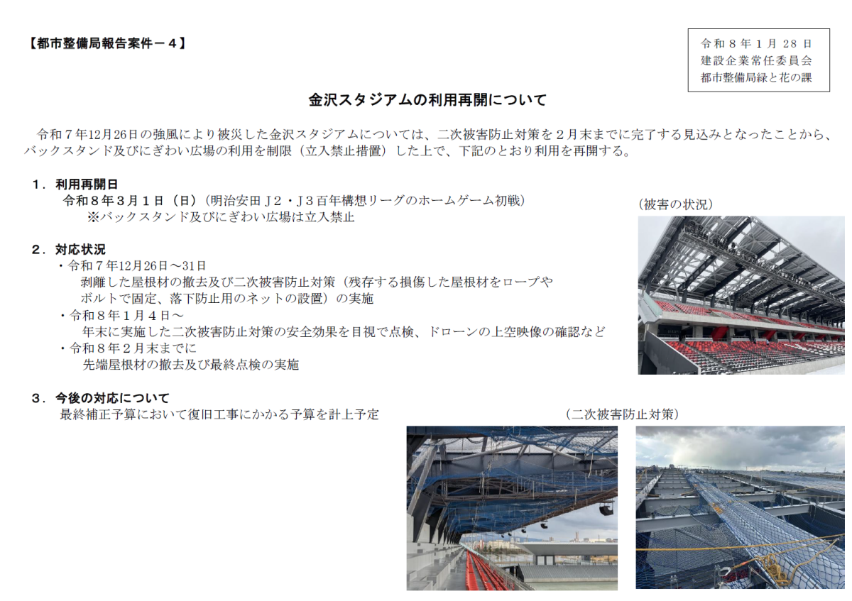 またスタジアムの利用についてですけれども、昨年末被災した直後に剝離した屋根材を撤去いたしました。また飛散防止のために、残存する屋根材はロープやボルトで固定するなど、応急的な安全対策を講じたところであります。さらに、利用再開に向けまして安全対策に万全を期すために、二次被害の防止対策として、先般、残るピッチ側の先端部分の屋根材についても撤去完了いたしまして、一連の安全対策についての最終点検を終えたところであります。また、復旧工事・補強工事の期間中におきましても、利用者の安全を第一に、被害のあったバックスタンドの立ち入りは制限いたします。また試合のある週末には工事を行わないなどの措置を講じることで、利用者の安全は確保できますので、3月1日の明治安田J2・J3百年構想リーグのホームゲームの初戦に施設利用を再開するものです。