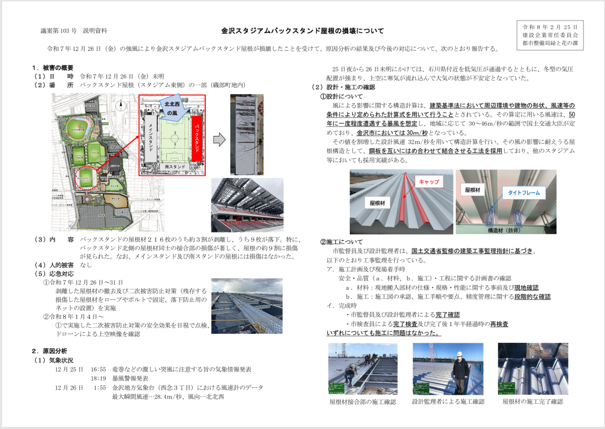 次に、金沢スタジアムの屋根が落下した件についてです。私は公共施設というものは安全が第一ですし、もし予期せぬ損傷を受けた場合は原因を真摯に究明し、次に生かすべきと考えます。12月26日未明に、金沢スタジアムのバックスタンド側の屋根があめるんパーク側に落下しました。片持ち構造の屋根で、50㎝×27.5mのガルバリウム鋼板材1枚200㎏の屋根材216枚がはめられていたところ、そのうち3割の屋根材がはがれ、9枚が外側に落下し、その後の調査で9割が損傷を受けたというものです。人的被害は幸いにしてありませんでしたが、現場の写真ではあめるんパークのすぐそばに200㎏の屋根材が散乱し、もし日中だったらとぞっとしました。市長、2024年2月供用開始から2年未満です。80億円もかけた施設なのになぜ?という疑問が寄せられています。