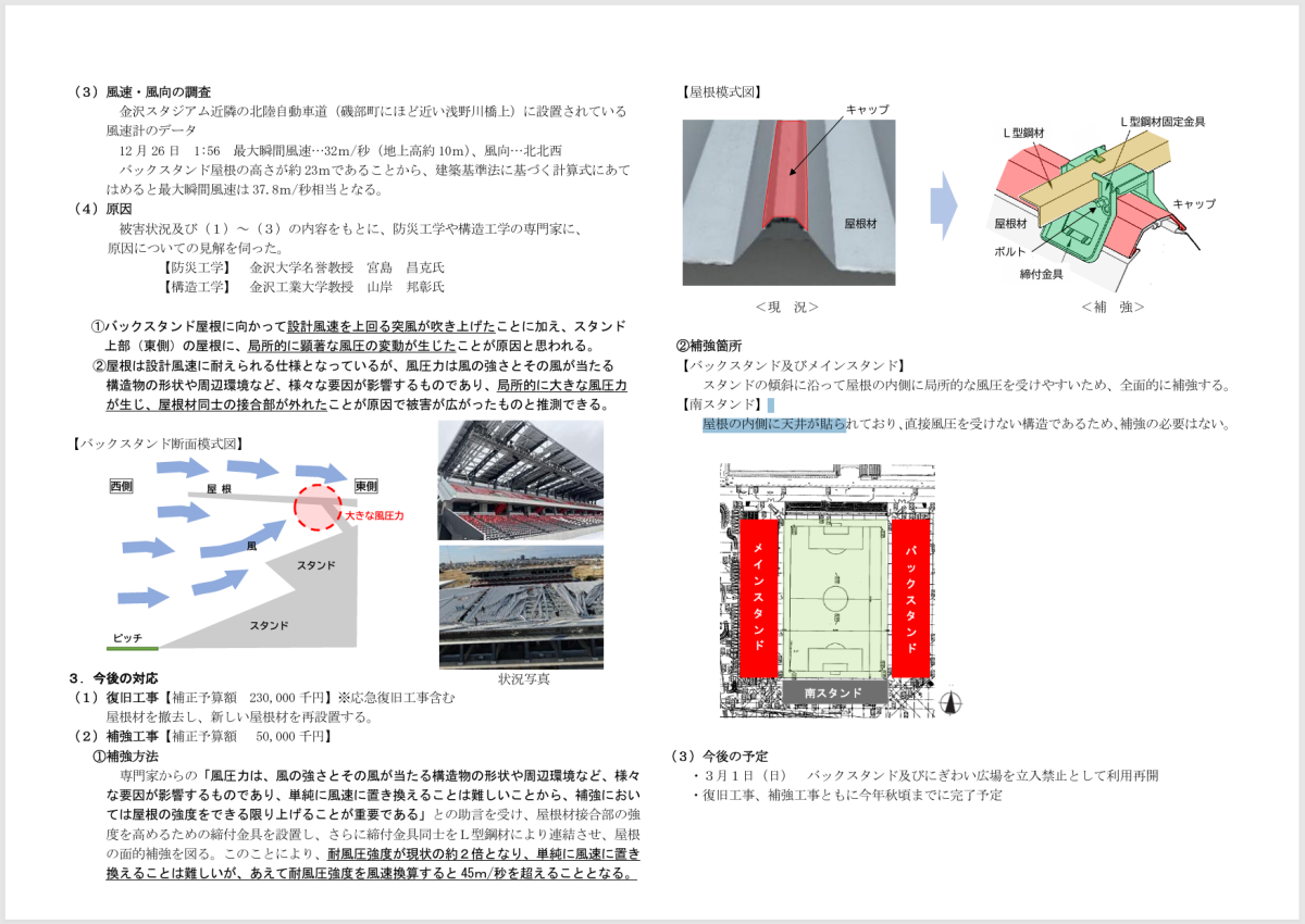 今年1月28日の建設企業常任委員会で原因について回答がありました。「被災当時の気象に関する情報を踏まえた専門家の意見では、バックスタンド屋根に向かって設計風速32m/sを上回る突風が吹き上げたことが原因であるという見解をいただいた」「スタジアムの近隣に設置されている風速計によると最大瞬間風速32m/sを記録し、屋根の高さ23mで補正すると37.8m/sとなる」というものです。一方、金沢気象台は同日の最大瞬間風速を北北西28.4m/sと発表しており、スタジアムの設計風速32m/sを超えていません。気象台の風速計は西念の合同庁舎の屋上に設置され、その高さは48.4mでありスタジアムの高さをはるかに超えています。