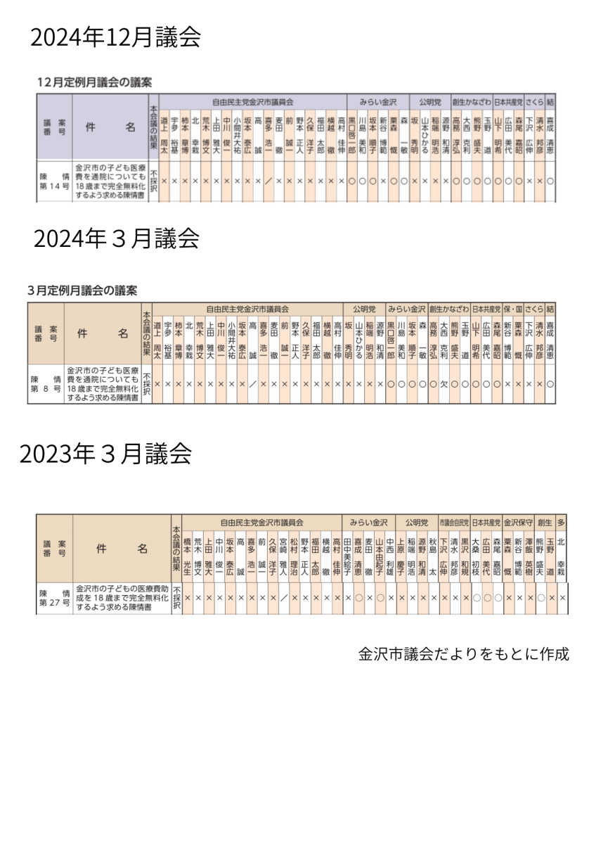 ちなみに市議補選もありますので、最近の「子ども医療費助成の拡充を求める」金沢市議会への請願に対する各会派・議員の態度も参考にしていただければ幸いです。