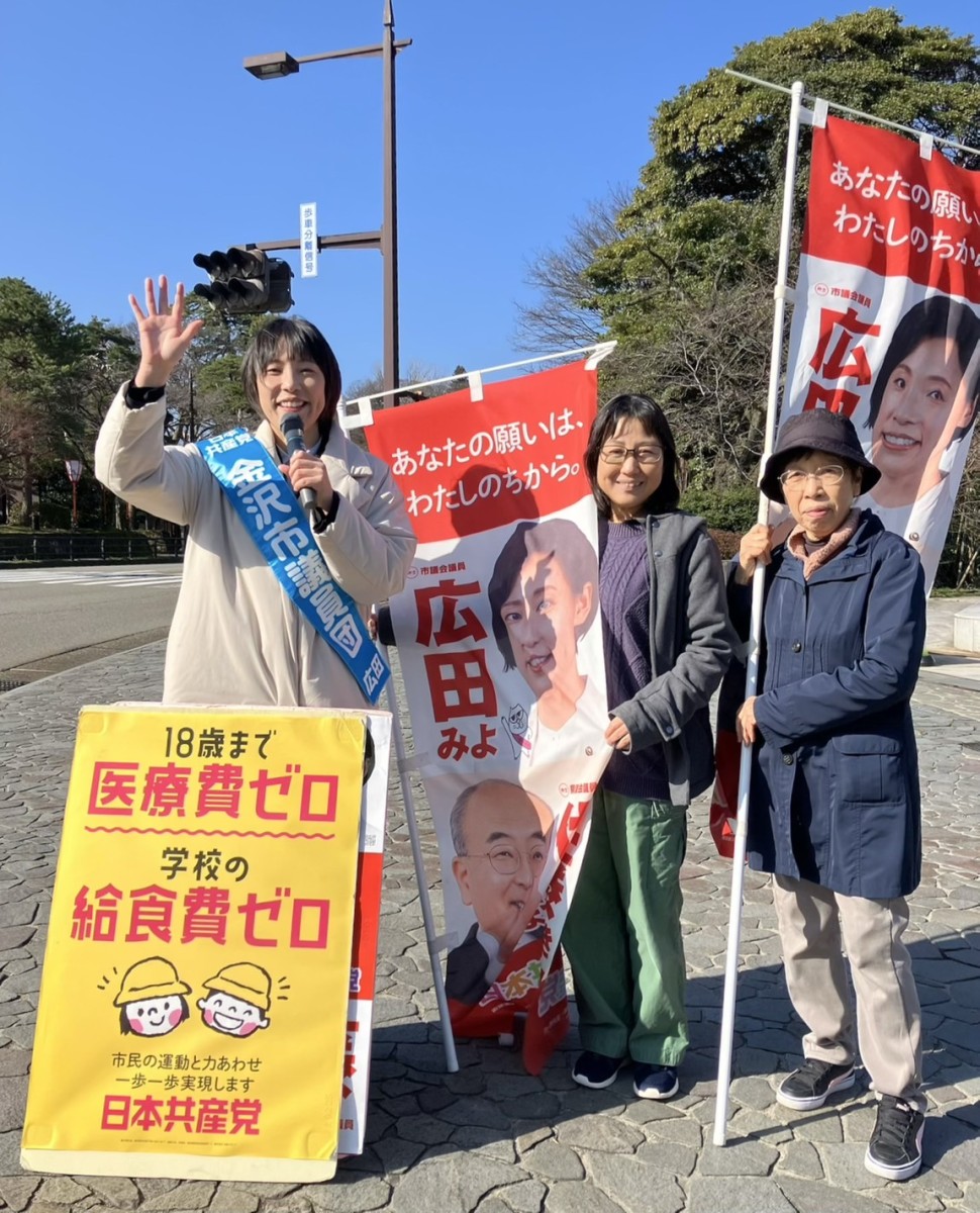 応援ありがとうございます! 2026年3月16日 ブログみよみよ日記 くらし まちづくり 本日は田井町と兼六園下にて訴えました 近くに用事があった友人も飛び入り参加してくれましたー! 自転車の方も引き返して「がんばってください!」とお声かけくださり、大変な情勢ですががんばる力がみなぎりました。 みんなで戦争止めるため、そしてくらしよくするためがんばりましょう(^▽^)/ このページをシェア