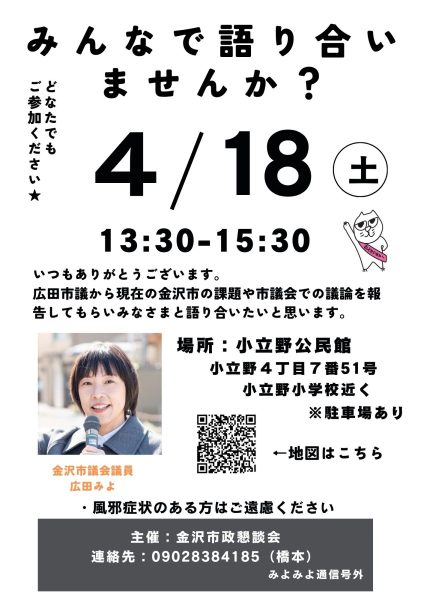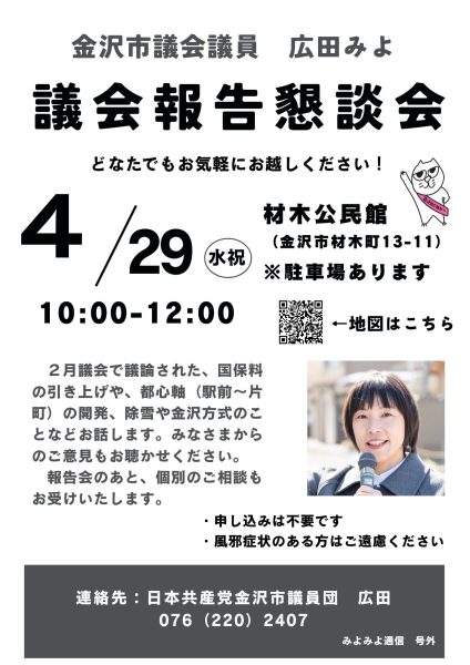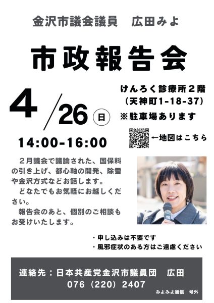 4月に「金沢市議会議員・広田みよの議会報告会」を4回予定しています 2026年3月28日 ブログみよみよ日記 お知らせ 【4月の議会報告会のお知らせ】 いつもありがとうございます。 お待たせいたしました。 4月実施の議会報告会のお知らせです。 ご都合のよい日程、場所にあわせてお選びいただけます。 どなたでもご参加ください(^▽^)/ このページをシェア