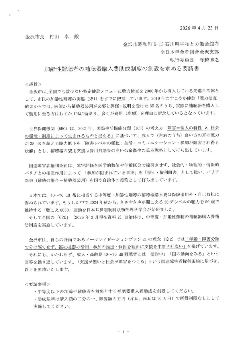 昨日は、年金者組合のみなさんが金沢市に対して、加齢性難聴者の補聴器購入助成制度を創設してほしいと申し入れをしました。