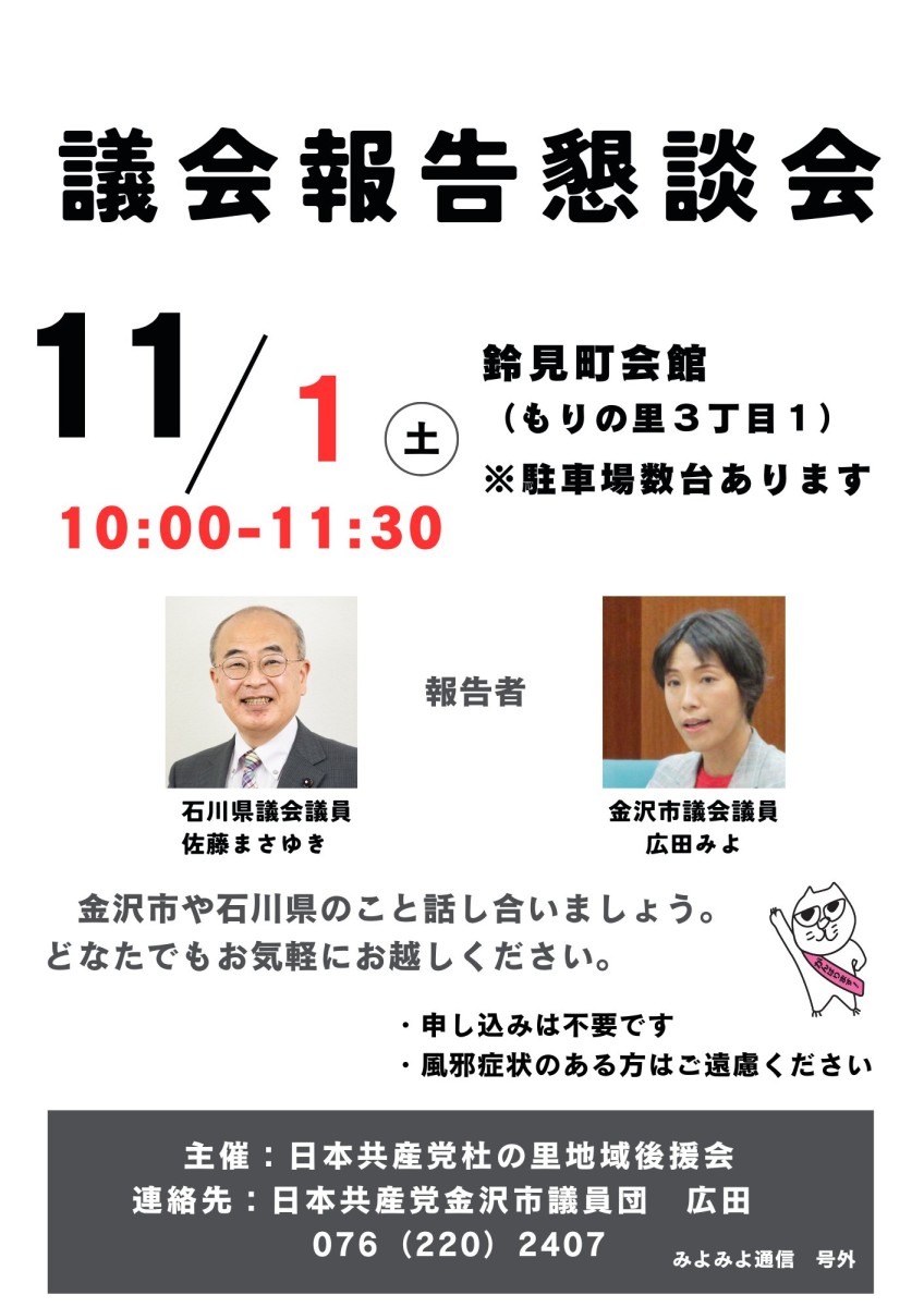 11月の広田みよ金沢市議会報告会&市議会意見交換会のお知らせ