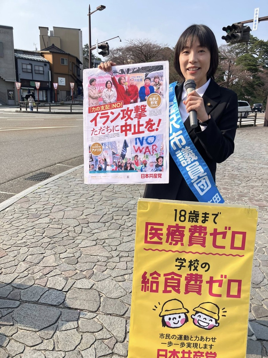 今朝は大桑と笠舞で訴えました 冒頭にイラン攻撃について。 明日に日米会談が迫っています。 日本政府は、米国のイラン攻撃に絶対に協力・加担してはなりません。ホルムズ海峡に自衛隊を派遣してはいけません。 イランへの攻撃中止こそ、ホルムズ海峡の安…