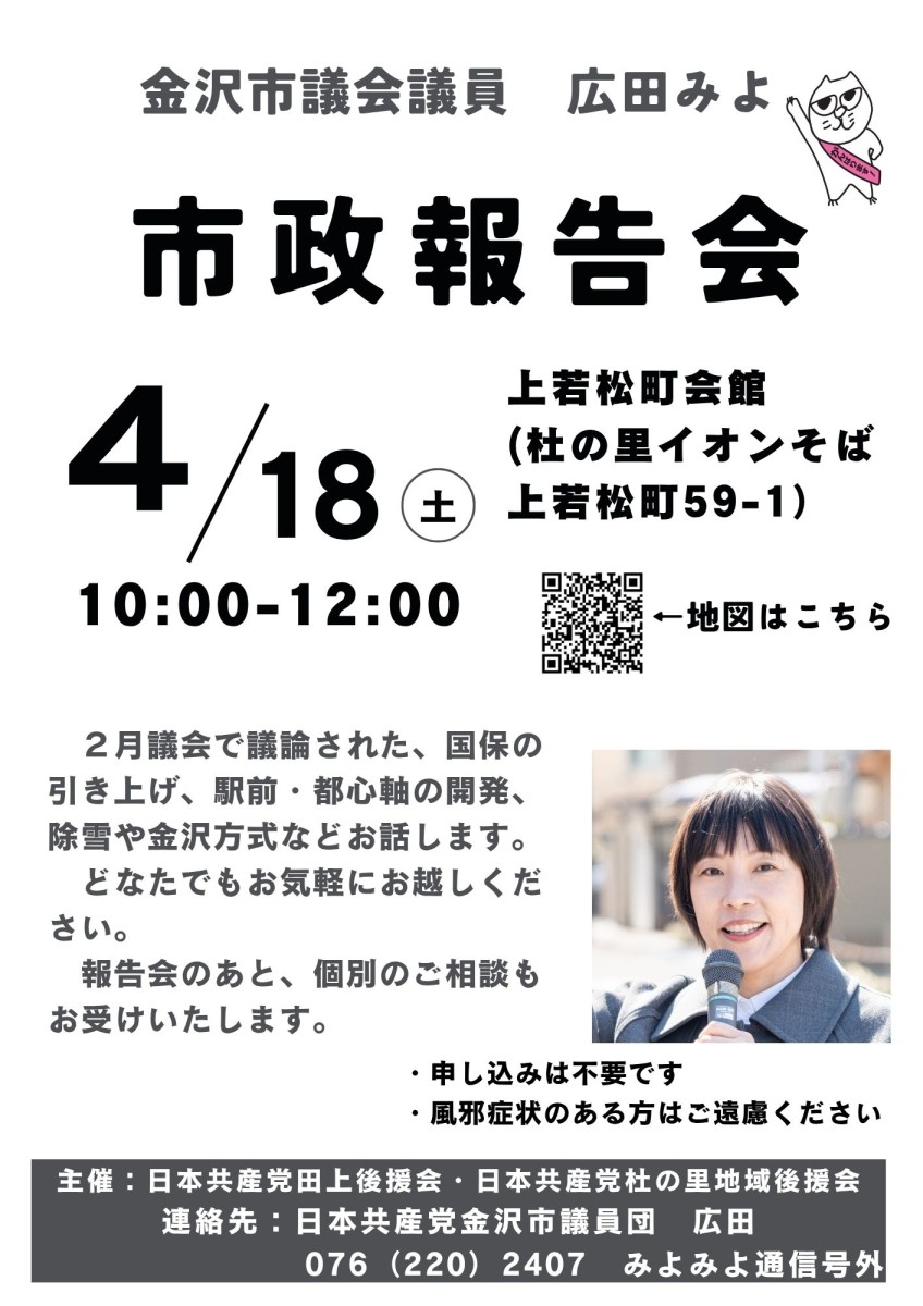 4月に「金沢市議会議員・広田みよの議会報告会」を4回予定しています